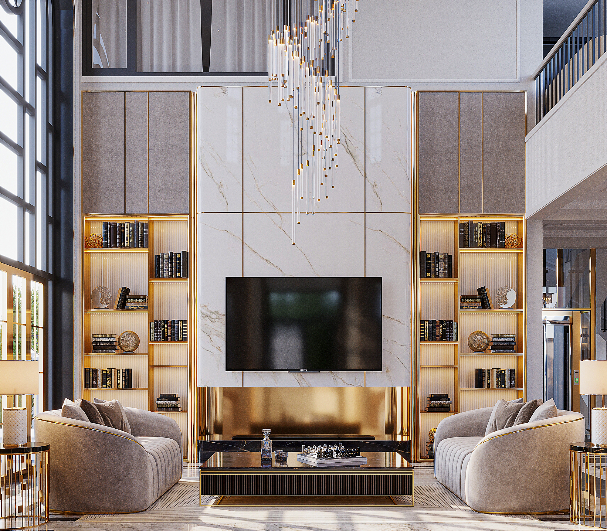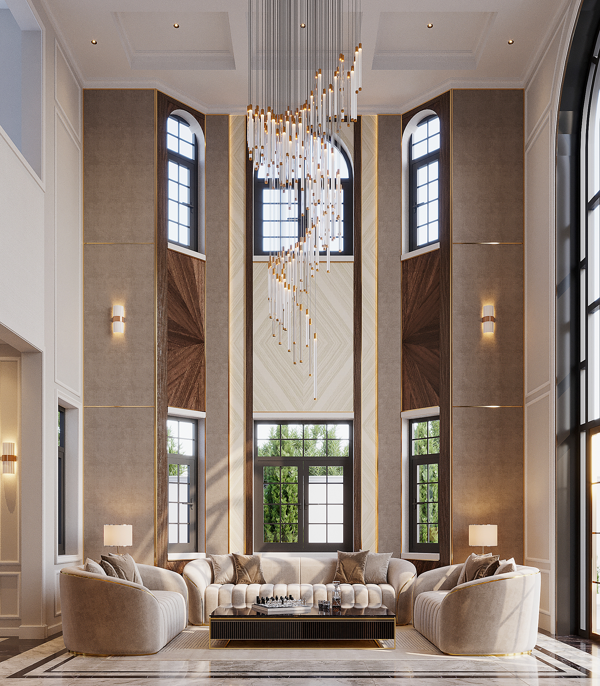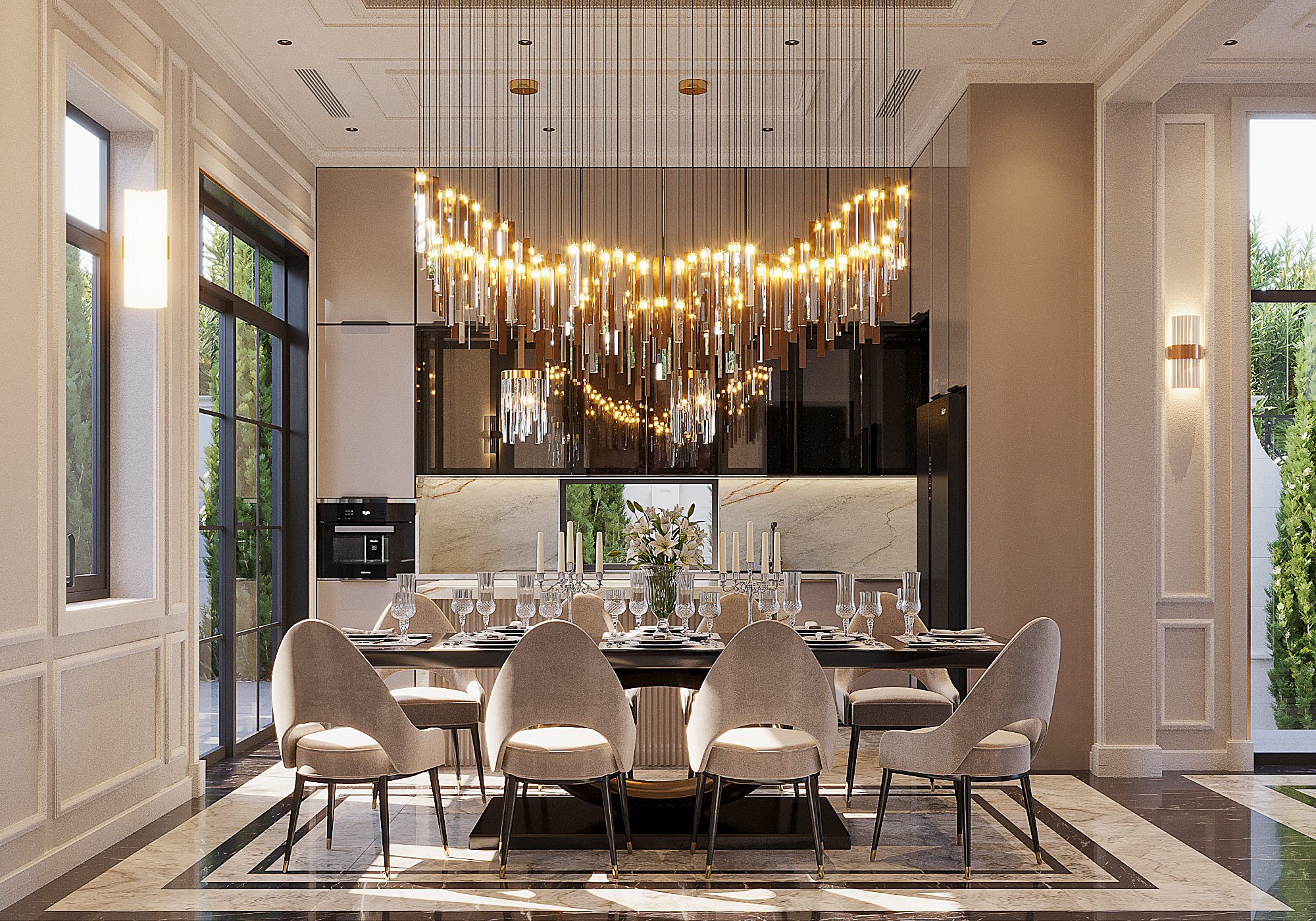 Với lối kiến trúc tân cổ điển cùng thiết kế xa hoa, sang trọng, không gian từ phòng khách đến phòng bếp của gia đình anh Nam chị Trang như bừng lên sức sống. Gam màu trung tính: kem, nâu, ghi … được kết hợp hài hòa trên những chất liệu nội thất khác nhau. Cửa sổ kính lớn được sử dụng để lấy tối đa ánh sáng ban ngày cũng như tạo sự lưu thông không khí khi cần thiết.