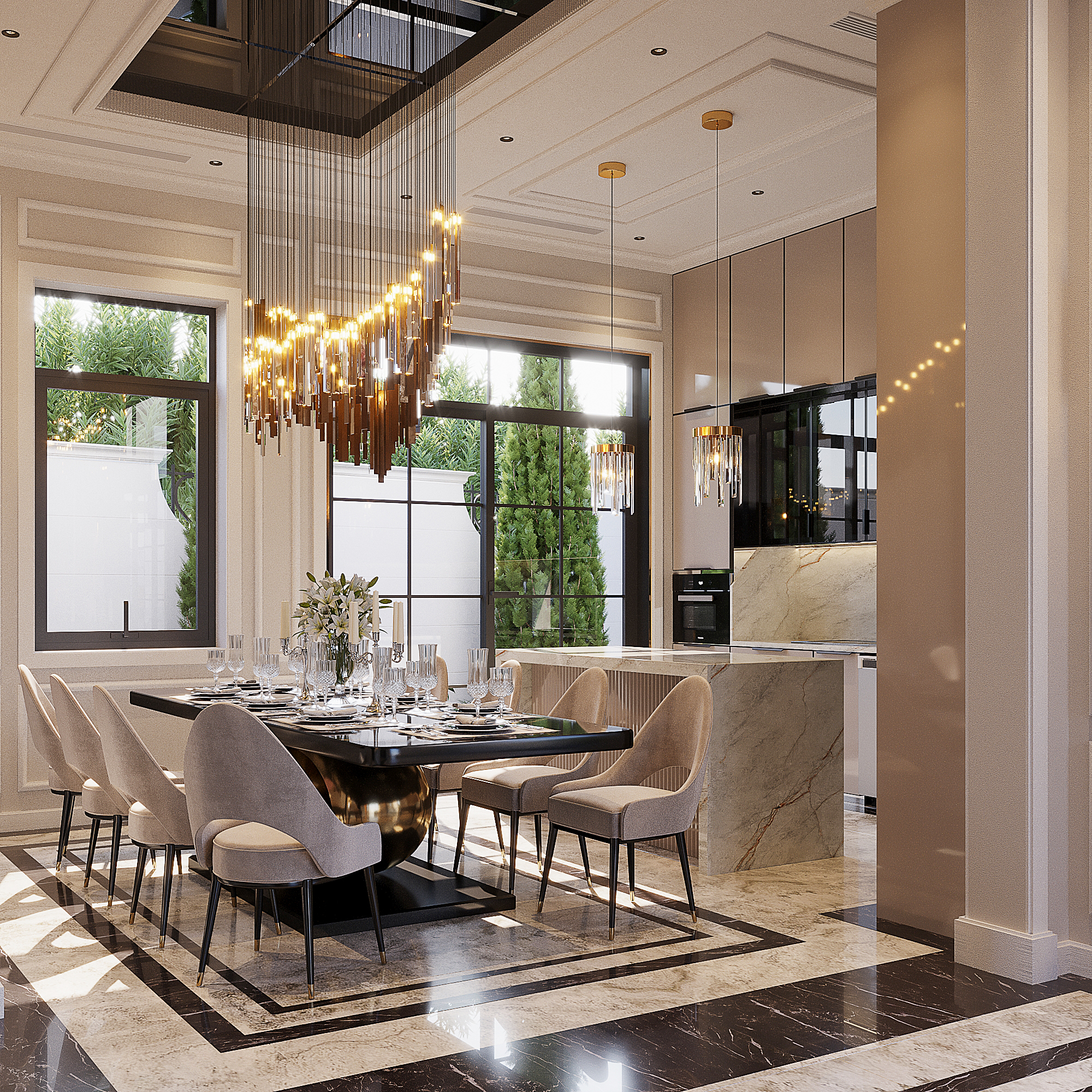 Với lối kiến trúc tân cổ điển cùng thiết kế xa hoa, sang trọng, không gian từ phòng khách đến phòng bếp của gia đình anh Nam chị Trang như bừng lên sức sống. Gam màu trung tính: kem, nâu, ghi … được kết hợp hài hòa trên những chất liệu nội thất khác nhau. Cửa sổ kính lớn được sử dụng để lấy tối đa ánh sáng ban ngày cũng như tạo sự lưu thông không khí khi cần thiết.