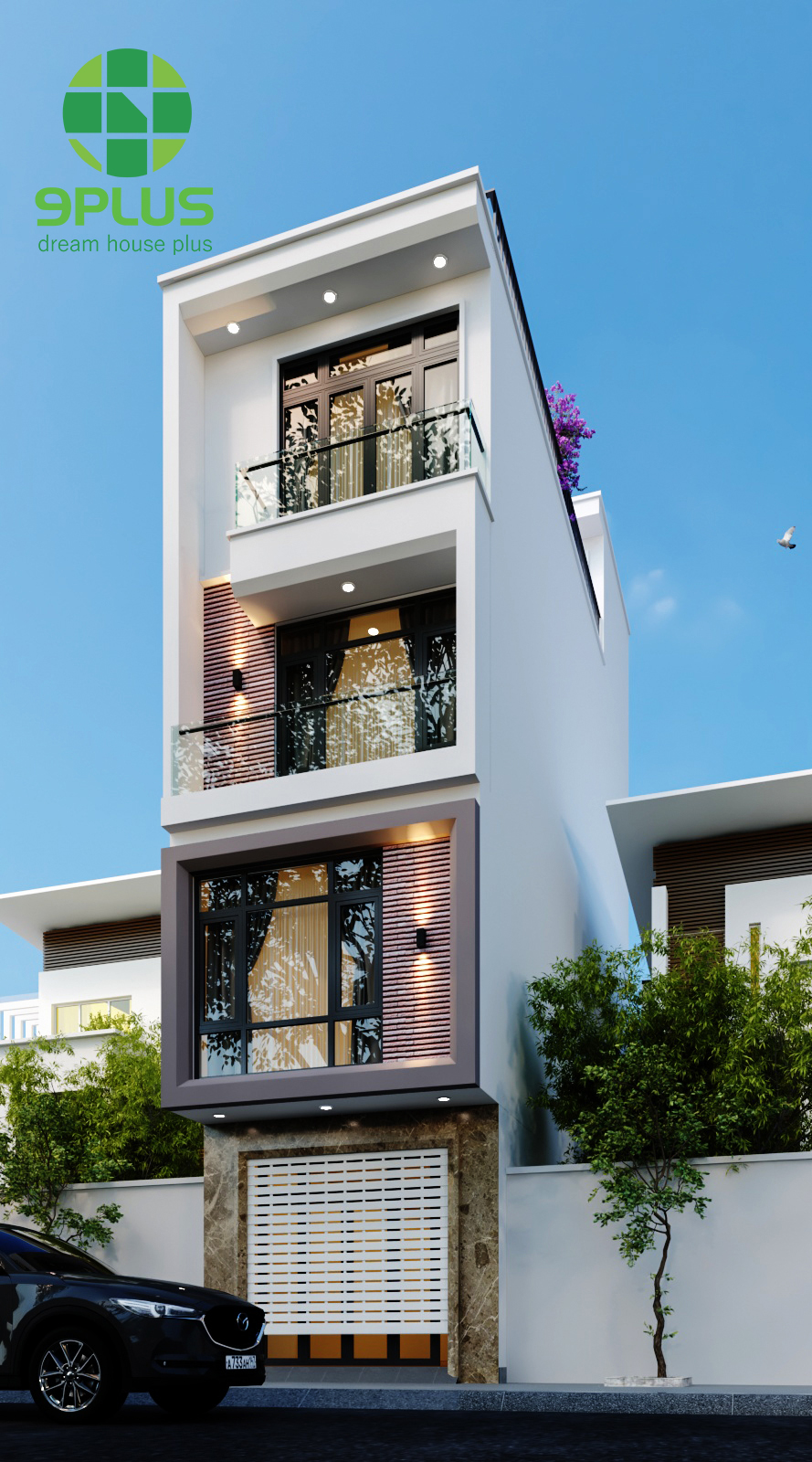 Ngôi nhà mặt tiền hẹp nhưng thiết kế tối ưu không gian theo chiều đứng. Hệ cửa kính lớn kết hợp lam gỗ v